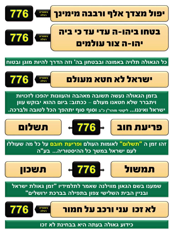 זה עניין של: צירוף מקרים = 776 לצרף את כל המקרים לאחד להבין שאין עוד מלבדו וגם כשנאמר "היום אם בקולו" כבר טמון בזה סוד הגאולה