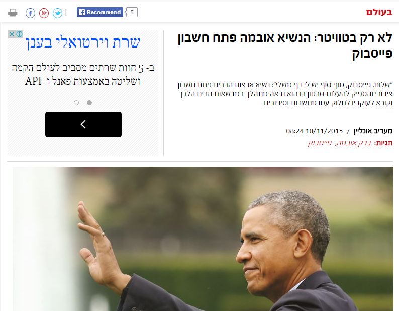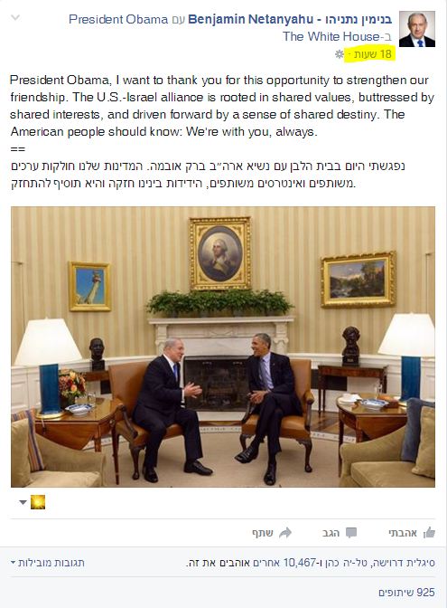 שימו לב בפגישתו עם נתניהו ראו איך שאובמה מנסה להתחבב על נתניהו באופן מלאכותי.. אובמה פותח לראשונה חשבון פיסבוק (מוזר לפתוח דבר בסיסי כזה אחרי 6 שנים בתפקיד לקראת יציאתו) והוא פותח בדיוק בזמן שהוא עם נתניהו. זה מרמז שזה התחבבות מלאכותית. והוא בקרוב יהפוך את עורו וכן נתניהו מעלה פוסט על 'הפגישה הטובה' ונתניהו מתייג אותו . מה הסיכוי שכל זה קורה במקביל..