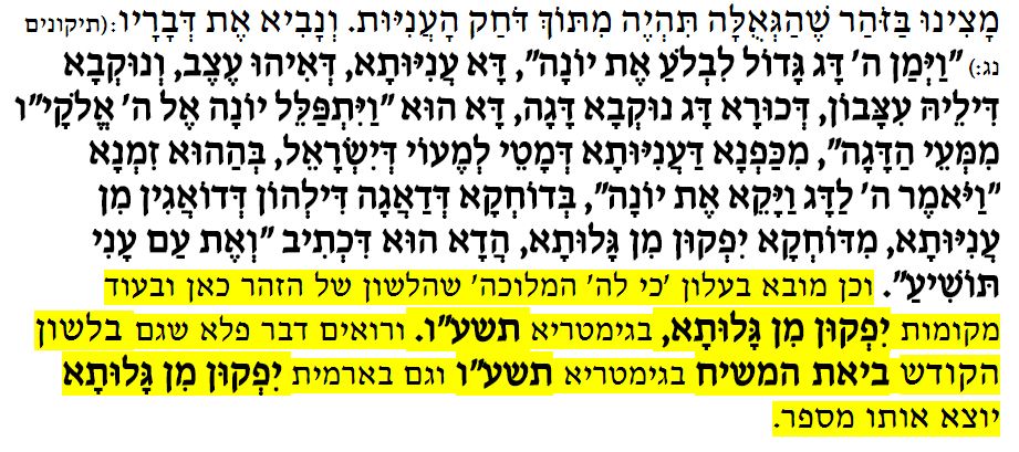 בשעה שמלך המשיח נגלה בא ועומד על הגג של בית המקדש, והוא משמיע להם לישראל ואומר להם ענוים הגיע זמן גאולתכם, ואם אין אתם מאמינים ראו באורי שזרח עליכם, שנאמר קומי אורי כי בא אורך וכבוד ה´ עליך זרח.