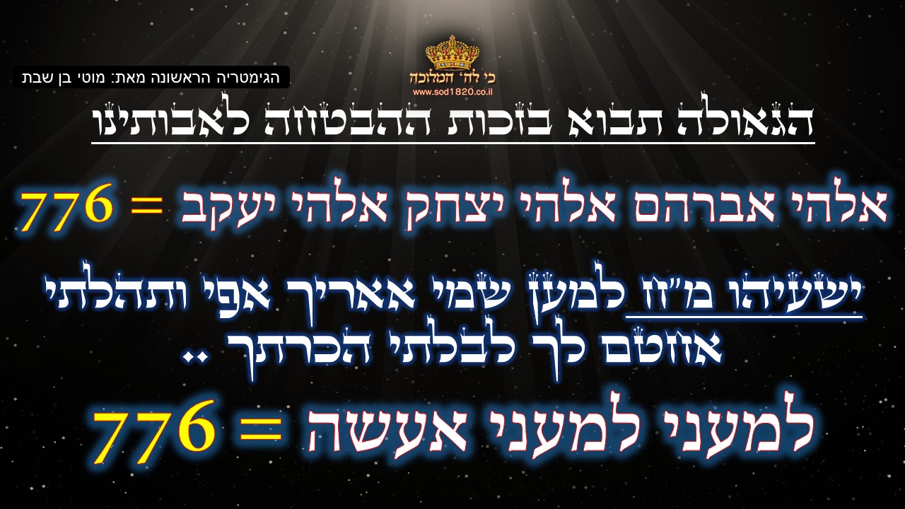 כזכור צירוף מקרים = 776 – ביאת המשיח = 776 – תשע"ו = 776 – זה: מצב של שלמות = 776 – זה סוד הגאולה = 776 (מילוי ללא מילה)