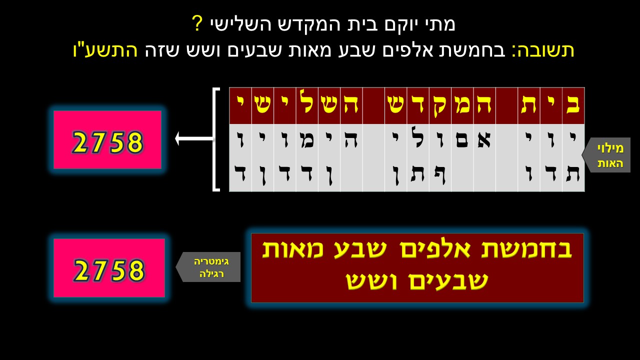 שימו לב: נכתוב את המספר 2212  (זמן הגאולה) נוסיף משיח בן דוד = 424 – וכעת נוסיף אליהו הנביא = 120 – נחבר הכל 2212+120+424 = 2756 שוב קיבלנואת השנה בספרות: חמשת אלפים שבע מאות שבעים ושש = 2756 – שוב הכל חוזר להתחלה
