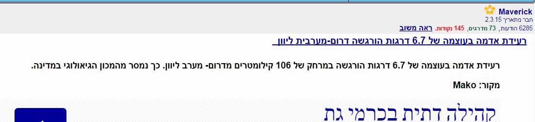 שימו לב איזה רמזים חדים ביום ה 7.6 "למניינם" רעידת אדמה בפיליפינים בעוצמה 6.7 - וכן מעניין מאד שנפל בבאר שבע מישהו בן 67 מסולם... נפילה מסולם: דווקא בבאר שבע.... גם סולם יעקב היה בבאר שבע ... וכל זה קורה ביום 7.6 ... אין עוד מלבדו... הגיע הזמן לקבל בינה= 67 ולקבל את כוחו של: בן דויד = 76