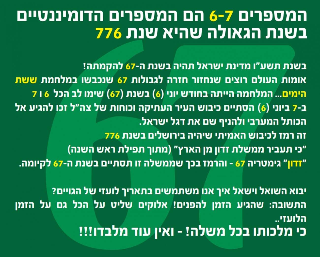 עוד שני רמזים במספר 6.7 רמז שמראה שיש רק יד אחת פעילה ביקום וזה רק יד ה' לרמזים קודמים 67