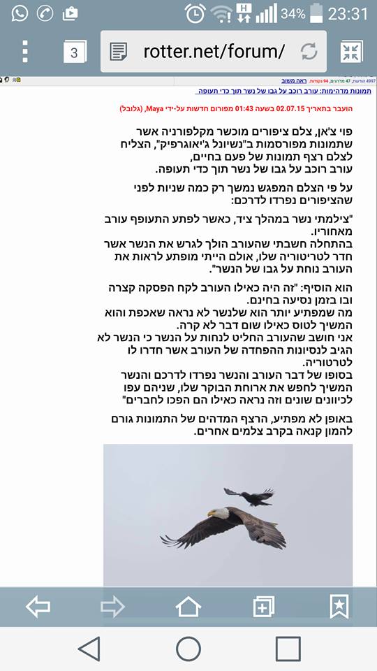 מאת יניב לוי שבוע טוב ,הפוסט עם הליויתן הביא לי חשק לשלוח לך את הסיפור של התמונות המפליאות שתפסה עדשת המצלמה של האיש שצילם את העורב על הנשר ,ומצנו קשר מדהים שקורה ממש עכשיו ,אז כך הצילום נעשה בחופיי אלסקה קליפוניה. ועכשיו בחדשות הרוסים שלחו מפציצים לאזור זה בדיוק עכשיו אז האזור הזה מועד לפורענות כי הנשר הגדול זה ארה"ב ורואים שהעורב יכול לו ,והעורב יכול להיות סמל לשליחות רעה על גב של הנשר (ארה"ב) וגם העורב ידוע שהיה שליח מתיבת נח ,וגם שליח של אליהו הנביא זכור לטוב –