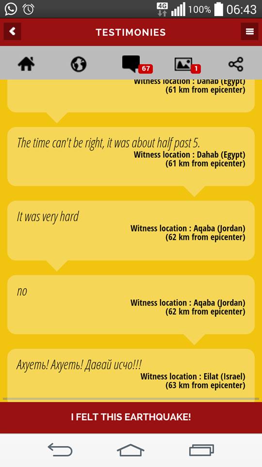 בוקר טוב בהקשר לרעידת האדמה שהורגשה בארץ בשבת. יש לי אפליקציה של רעידות אדמה בעולם, צילמתי לכם את המסך מהעדכון לגבי הרעידה שהיתה אצלנו , שימו לב למספר התגובות בנושא + (תמונות חדשות 67 )